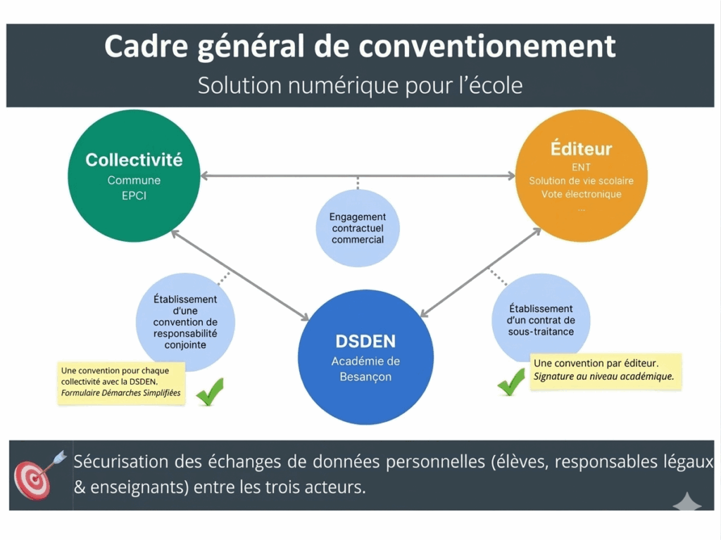 - Une convention de responsabilité conjointe conforme à l’article 26 du RGPD devra également être conclue entre la collectivité et le DASEN.